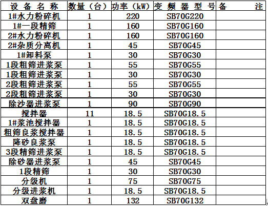 造紙生產(chǎn)線(xiàn)上的輔機很多,為節能基本都需要變頻調速。實(shí)踐已經(jīng)證明,造紙輔機實(shí)施變頻調速后,平均節能在12%,經(jīng)濟效益明顯。浙江富陽(yáng)某造紙廠(chǎng)生產(chǎn)線(xiàn)上的部分輔機設備如下表: