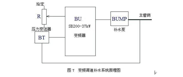 為更進(jìn)一步的節能,對換熱站實(shí)施了自動(dòng)化改造,循環(huán)泵和補水泵用變頻調節,整個(gè)城市供熱系統用計算機進(jìn)行監控,實(shí)現了換熱站無(wú)人值守。通過(guò)循環(huán)泵使熱水在供熱系統中運行,管道、閥門(mén)的泄漏引起循環(huán)水的水壓降低,如不及時(shí)補水,會(huì )造成供熱系統運行不正常。補水泵的變頻泵補水方式比較簡(jiǎn)單,采用恒壓供水方式,設定壓力為4kg。本例選用一臺森蘭SB200系列3.7KW變頻器,選用森納斯DG130W-BZ-A 1MPa壓力變送器,變頻調速補水系統如圖7所示:
