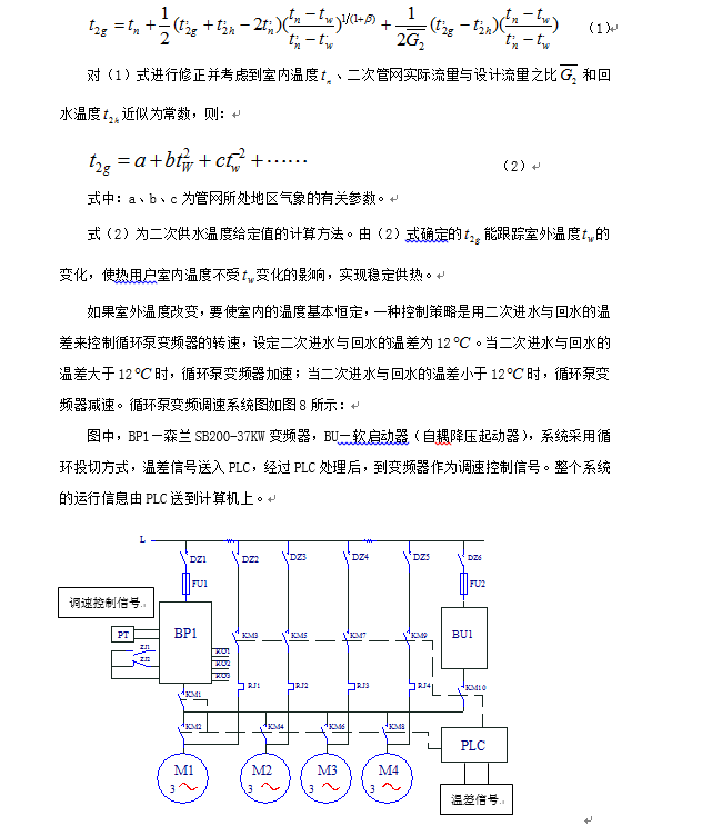 為節省能源,減少城市污染,充分利用火力發(fā)電廠(chǎng)蒸汽輪機發(fā)電后的余熱,在冬季對北方城市集中供熱。從發(fā)電廠(chǎng)送出來(lái)的熱水,到城市中的換熱站時(shí),一次供水熱水溫度有90多度,經(jīng)過(guò)熱交換器后,一次回水熱水的溫度下降到60多度,然后再流回發(fā)電廠(chǎng)。送到城市居民家中的熱水,進(jìn)入換熱站熱交換器的二次回水溫度有50多度,二次供水溫度60多度。陜西寶雞有許多這樣的換熱站,其中有一換熱站有四臺熱交換器,四臺37kW的管道泵組成的循環(huán)泵組,一臺3.7kW的補水泵。循環(huán)泵和補水泵采用人工開(kāi)、關(guān)閥門(mén)控制流量,使管路的阻尼增大而造成電能浪費。