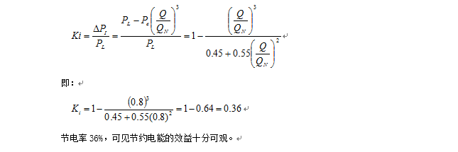 循環(huán)泵變頻調速后,所有的閥門(mén)開(kāi)度最大,系統的阻力最小,當平均流量是設計流量的80%時(shí),節電率可按GB12497《三相異步電動(dòng)機經(jīng)濟運行》強制性國家標準實(shí)施監督指南中的計算公式計算:
