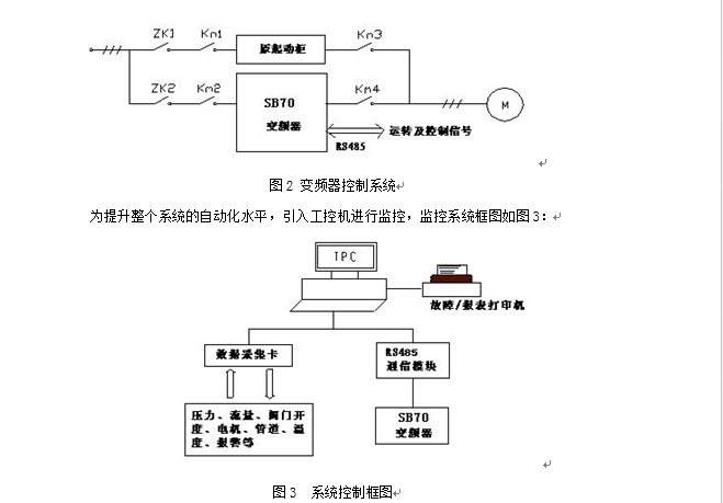 模擬量數據采集卡將壓力、流量、閥門(mén)開(kāi)度、電機溫度和管道溫度等模擬信號轉換成12位的數字信號,每一路信號占用數據采集卡上一個(gè)模擬通道,互不影響,采樣周期為300ms。SB70變頻器支持RS485半雙工串行通訊方式,通過(guò)在工控機上用IP函數或VB的MSCDMM通訊控件編制串行通訊程序,即可實(shí)現工控機與變頻器之間的通訊,本系統用VB的通訊控件編制。將采集到的數據信號,經(jīng)實(shí)時(shí)分析處理后,通過(guò)組態(tài)王監控畫(huà)面,監測現場(chǎng)傳輸的實(shí)時(shí)數據和歷史數據及設備的運行狀況、歷史曲線(xiàn)的分析、實(shí)時(shí)報表、歷史報表的打印、聲光報警等。