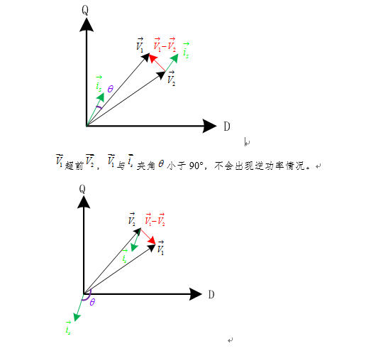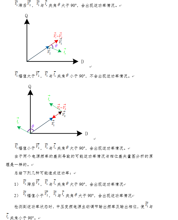 兩個(gè)電壓源同時(shí)給負載供電時(shí),由于并網(wǎng)運行時(shí)的相位、頻率和幅值之差導致的逆功率。下面從矢量圖分析幾種逆功率產(chǎn)生的機理,V1為岸用電源,V2為發(fā)電機電源。