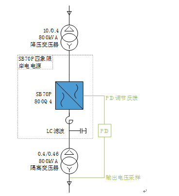 岸電系統在輸出隔離變壓器后端設置了輸出電壓采樣點(diǎn),該點(diǎn)采樣得到實(shí)時(shí)輸出電壓值后將數據送往系統內部PID機構進(jìn)行對比,將結果轉換為控制指令后送往岸電系統。岸電系統對輸出電壓進(jìn)行調節,最終輸出電壓達到預期輸出值,岸船連接段系統壓降問(wèn)題被解決。